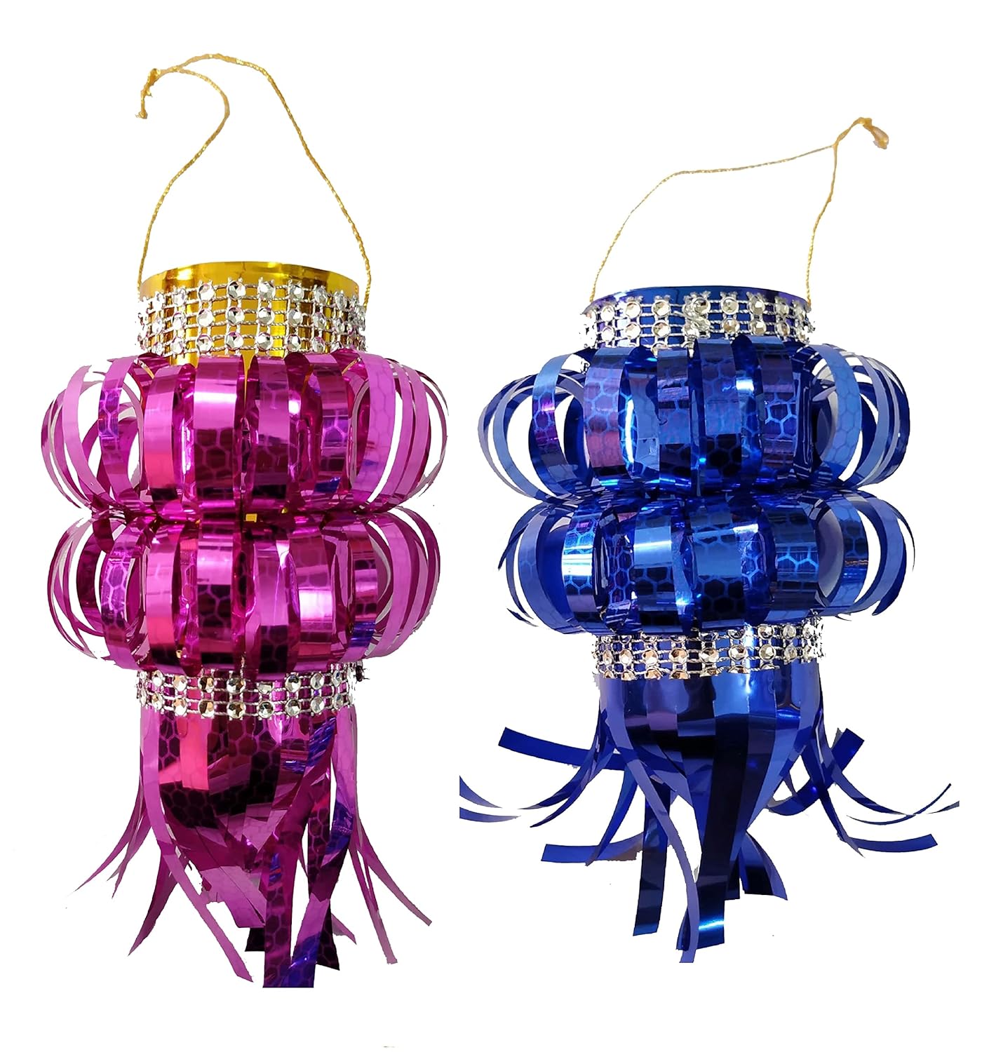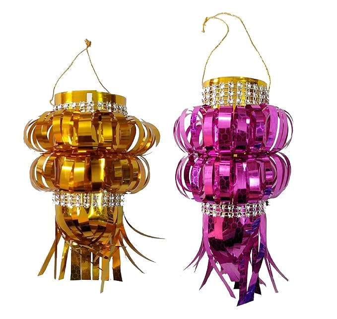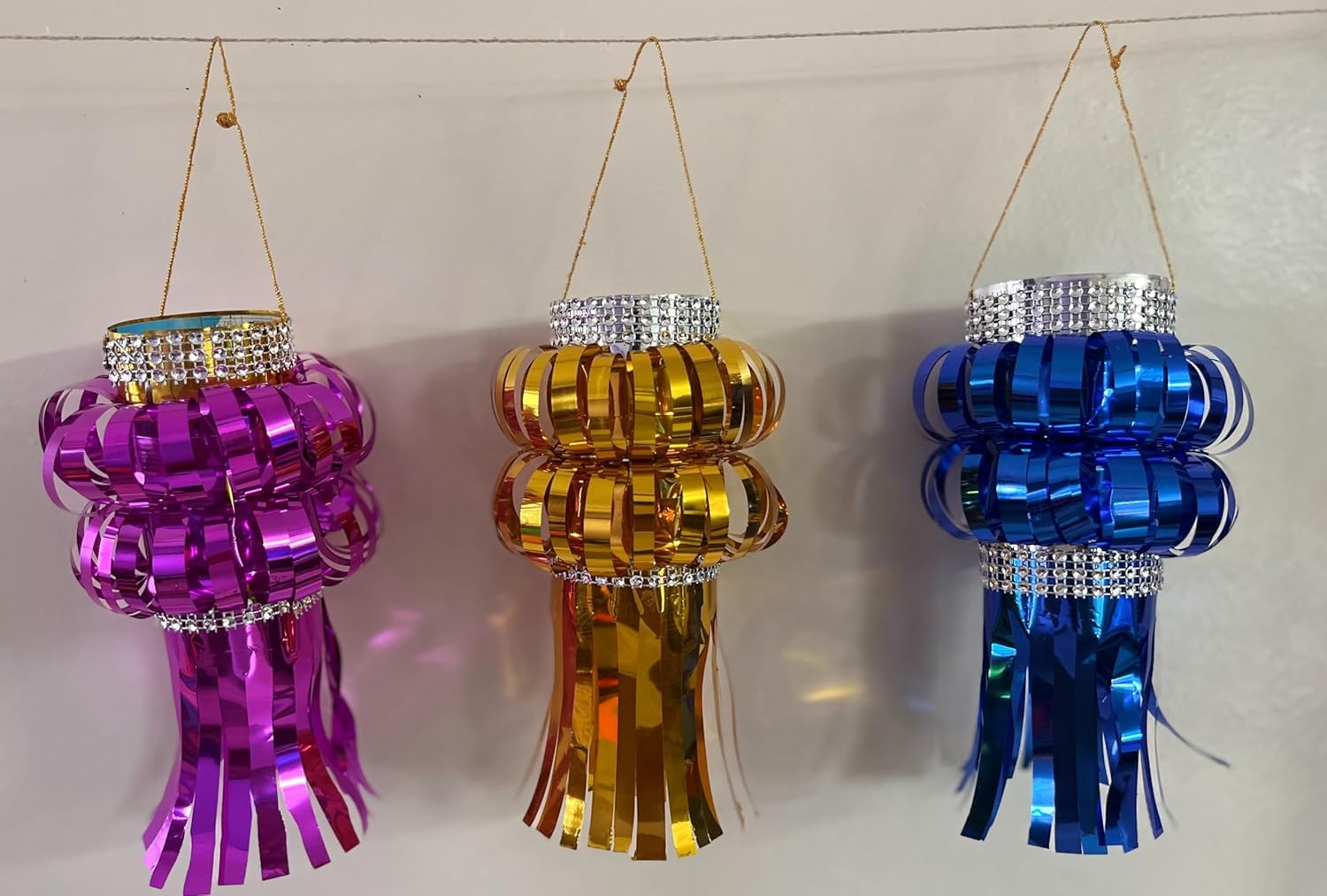 Set of 12 small ready to hang Double Loop Cylindrical Diwali lanterns handmade from foil paper.