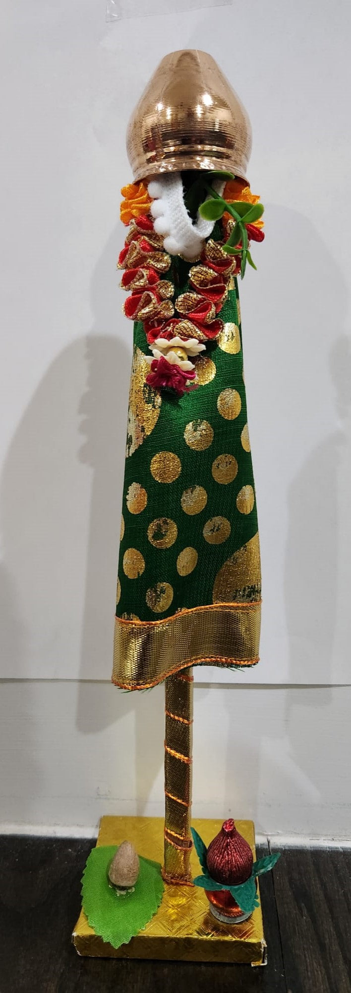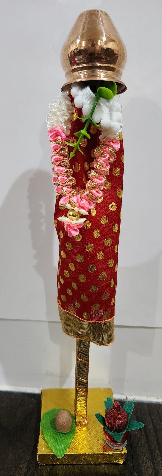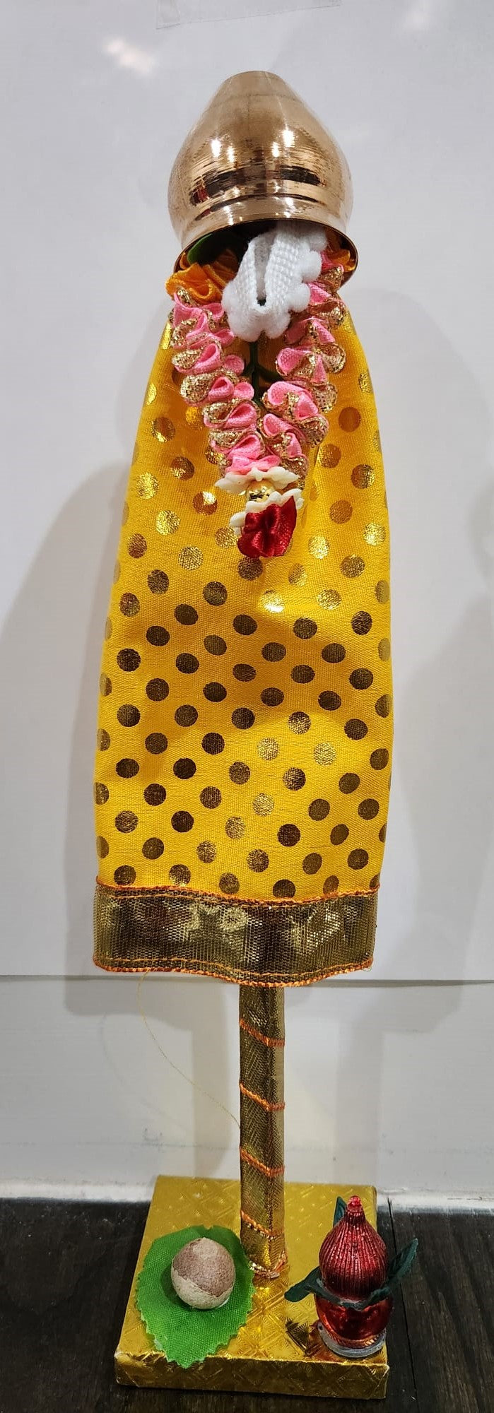 During Gudi Padwa, gudhis are arranged at every household. It is a bright, colorful silk scarf-like cloth tied at the top of a long bamboo. On top of it, one or more boughs of neem and mango leaves are attached with a garland of flowers. It is capped with a silver, bronze, or copper pot (handi or kalash), signifying victory or achievement.