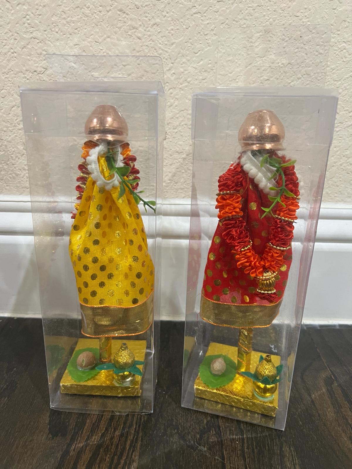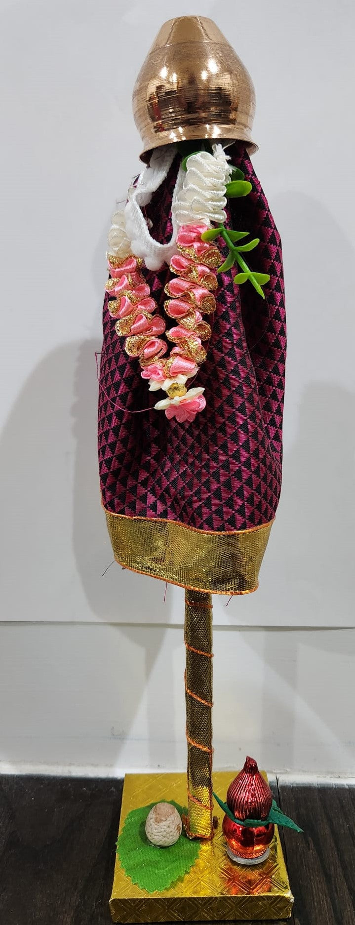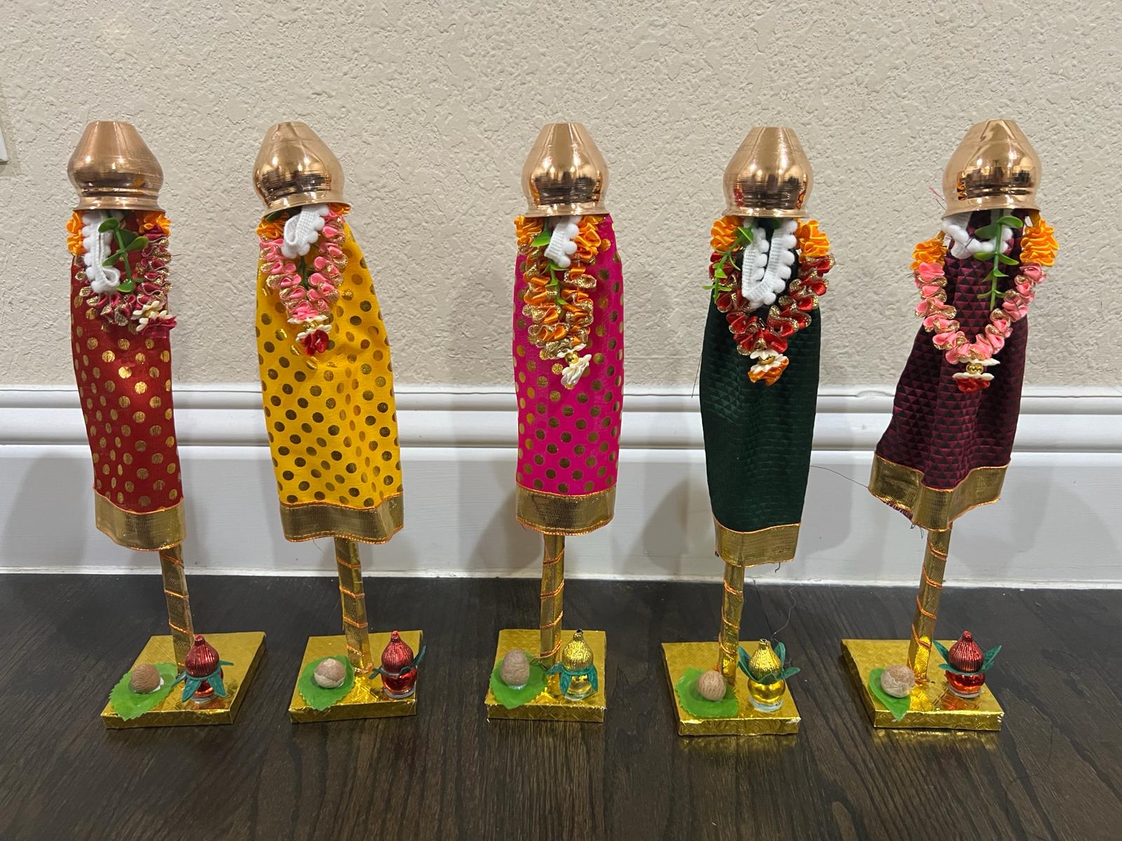 During Gudi Padwa, gudhis are arranged at every household. It is a bright, colorful silk scarf-like cloth tied at the top of a long bamboo. On top of it, one or more boughs of neem and mango leaves are attached with a garland of flowers. It is capped with a silver, bronze, or copper pot (handi or kalash), signifying victory or achievement.